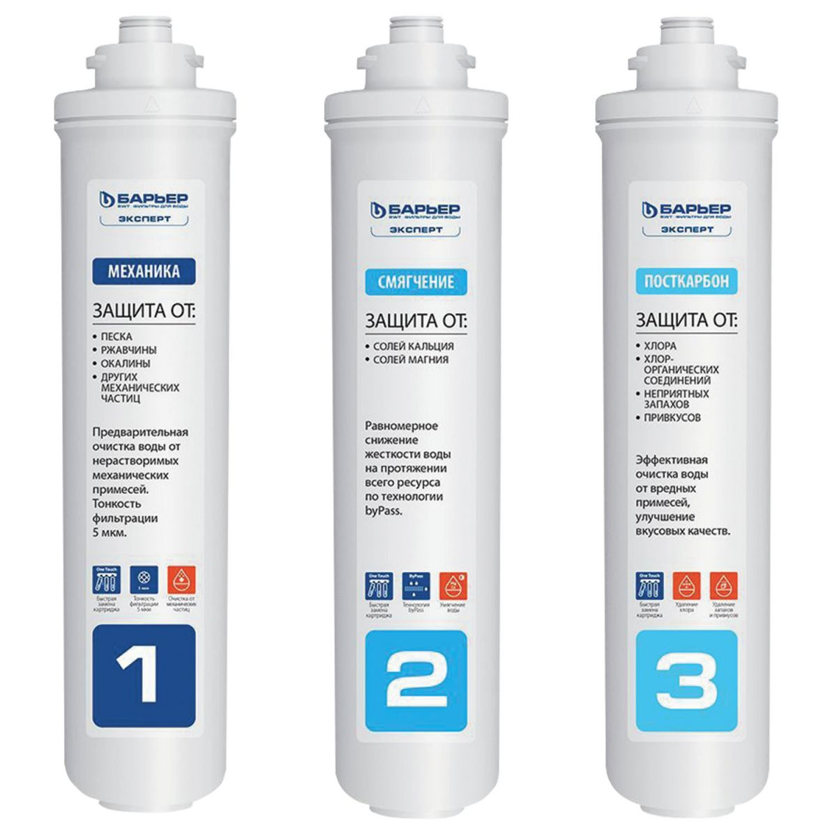 Комплект компактных сменных картриджей для фильтров. Применяется в трехступенчатых системах водоочистки «Эксперт Стандарт» для комплексной очистки водопроводной воды от основных содержащихся в ней вредных примесей.