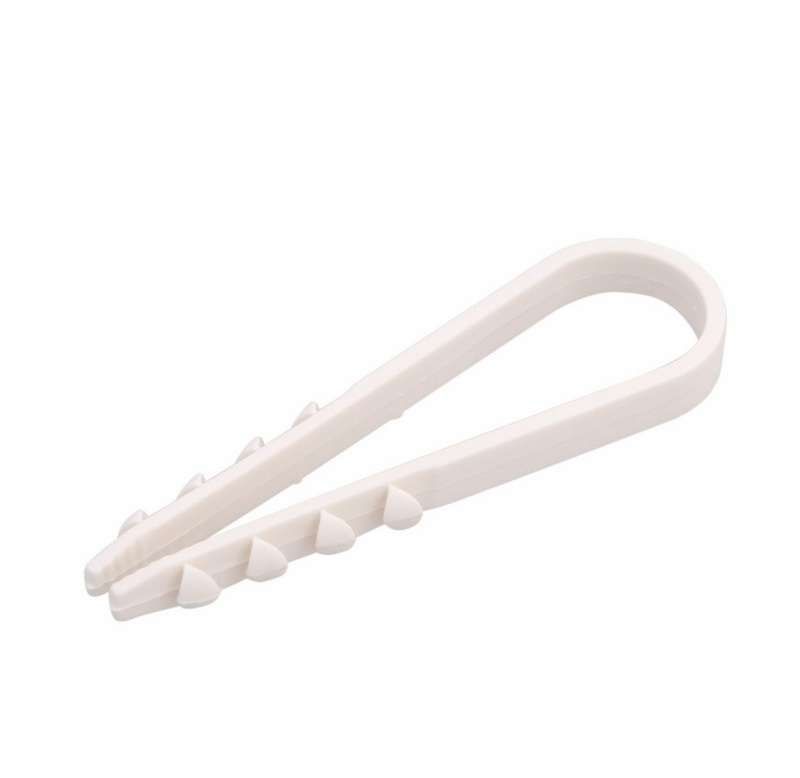 Дюбель-хомут предназначен для крепления провода, пучков проводов, гибких и жестких труб к бетону, природному камню, полнотелому кирпичу и пенобетону. Позволяет произвести простой и надежный монтаж, не требующий использования другого вида крепежа и инструмента. Исключает из процесса монтажных работ дюбели и шурупы. Достаточно лишь просверлить отверстие, вложить монтируемое изделие в петлю и вставить дюбель в стену. Дюбель-хомут изготовлен из нейлона с добавками и имеет следующие размеры: - длина: 48 мм - ширина: 12 мм - диаметр кабеля: от 5 до 10 мм - диаметр отверстия для дюбеля: 6 мм Температура монтажа: 0...+60 ? Температура эксплуатации: –40...+80 ?