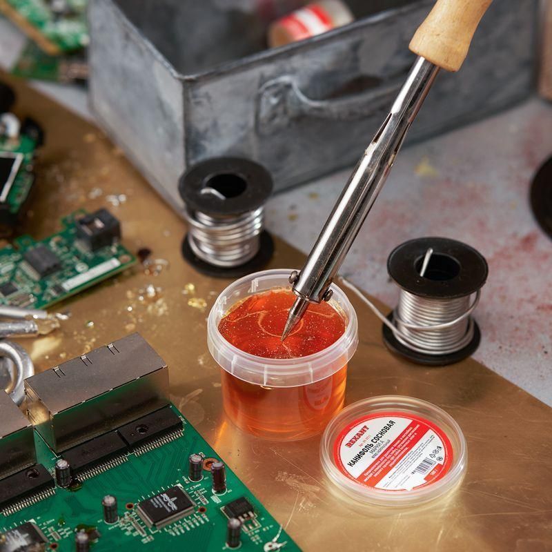 Канифоль сосновая марки А 100 г REXANT предназначена для удаления тонких и нестойких оксидов с поверхности под пайку, улучшения растекания жидкого припоя при пайке печатных плат и радиокомпонентов. Канифоль — хрупкое, стекловидное вещество темно-красного или светло-желтого цвета, применяется в качестве нейтрального флюса при пайке и лужении деталей или поверхностей припоями оловянно-свинцовой группы. Она входит в состав смол хвойных деревьев и получается из живицы. После пайки смывка не требуется. Характеристики: Тип: флюс нейтральный Масса нетто: 100 г Меры предосторожности: хранить в местах, недоступных для детей.