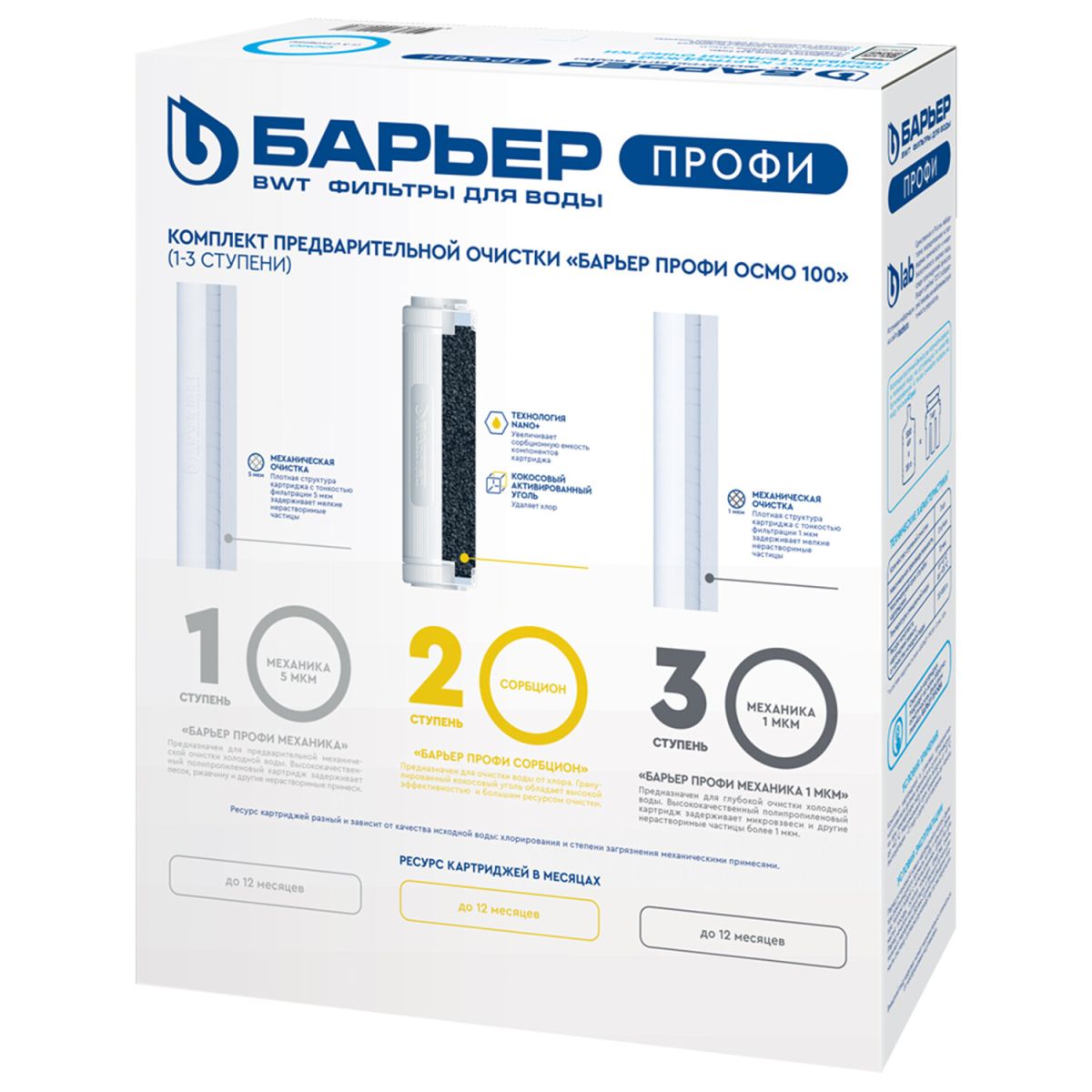 Комплект фильтроэлементов предварительной очистки для пятиступенчатой системы обратного осмоса. Такие картриджи для очистки воды удаляют механические взвеси и нейтрализуют соединения хлора.