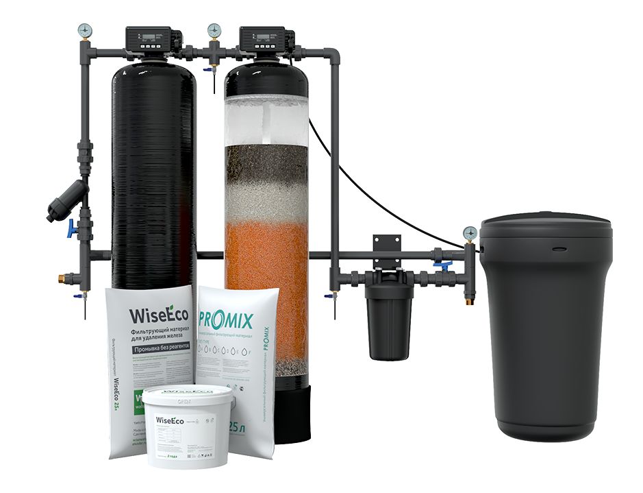 В состав оборудования входит: латунный грязевой фильтр, автоматический безреагентный фильтр-обезжелезиватель с воздушной подушкой, автоматический универсальный фильтр с баком для соли, манометры, термочехлы, все необходимые фильтрующие загрузки. Комплексная система NKX работает на эксклюзивных клапанах управления SCA19 (производство Франция), без подключения к электрической сети (на батарейках). Благодаря использованию современных технологий и материалов, а также безупречному качеству сборки, эти русифицированные блоки управления являются гарантом безупречной работы фильтров. Корпуса Canature, используемые в оборудовании, изготовлены из пищевого пластика. Система комплектуется неопреновыми термочехлами, которые предназначены для теплоизоляции и предотвращения образования конденсата на поверхности корпусов фильтров. Система изготавливается на собственных производственных мощностях. Состав системы: Грязевик (размер пор ячеек 500 мкм) предназначен для защиты автоматики водоочистного оборудования от крупнодисперсных взвешенных частиц (песок, трубная окалина и т.п.). Система обезжелезивания с воздушной подушкой предназначена для удаления мелкодисперсных частиц и взвесей, железа, сероводорода. Наличие воздушной подушки в верхней части фильтра интенсифицирует окислительные процессы и расширяет диапазон концентраций удаляемых загрязнений. Пополнение воздушной подушки осуществляется при каждой промывке фильтра. Данная система не требует установки отдельной системы аэрации, что позволяет сэкономить место в помещении и сократить капитальные затраты на оборудование. Качество очищенной воды по железу и марганцу соответствует международным стандартам. Универсальный фильтр с многофункциональной загрузкой ProMix предназначен для одновременного снижения содержания в воде ионов кальция и магния до рекомендуемого уровня 1,5-2,5 мг-экв/л, удаления железа, марганца, аммония и органических соединений природного происхождения. Регенерация фильтра производится в автоматическом режиме с помощью управляющего клапана SCA19 (Франция) по сигналу счётчика. Корпус фильтра и соляного бака, а также все контактирующие с водой элементы управления изготовлены из полимерных материалов пищевого класса. Для приготовления регенерационного раствора рекомендуется использовать таблетированную поваренную соль.