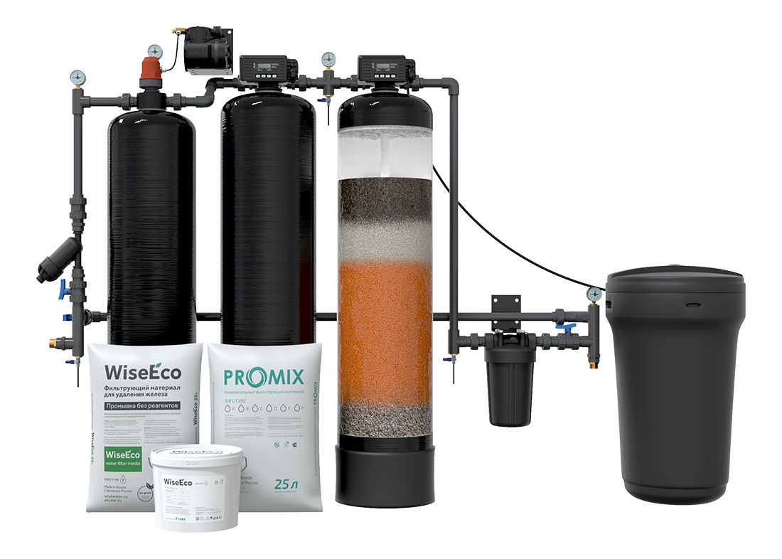 В состав оборудования входит: латунный грязевой фильтр, аэрационная колонна со встречными турбулентными потоками, безмасляный малошумный воздушный компрессор с регулятором расхода воздуха, автоматическая система управления работой компрессора, автоматический безреагентный фильтр-обезжелезиватель, автоматический универсальный фильтр с баком для соли, манометры, термочехлы. Комплексная система VKX работает на эксклюзивных клапанах управления SCA19 (производство Франция), без подключения к электрической сети (на батарейках). Благодаря использованию современных технологий и материалов, а также безупречному качеству сборки, эти русифицированные блоки управления являются гарантом безупречной работы фильтров. Корпуса Canature, используемые в оборудовании, изготовлены из пищевого пластика. Система снабжается неопреновыми термочехлами, которые предназначены для теплоизоляции и предотвращения образования конденсата на поверхности корпусов фильтров. Система изготавливается на собственных производственных мощностях. Состав системы: Аэрационная колонна применяется для насыщения обрабатываемой воды кислородом с помощью воздушного компрессора, предварительного окисления железа и органических соединений, удаления агрессивной углекислоты и сероводорода (удаление неприятного запаха). Интенсивная аэрация воды препятствует развитию микроорганизмов на загрузке фильтров. Использование напорной аэрационной колонны позволяет избежать потерь давления при прохождении воды через аэратор. Фильтр-обезжелезиватель удаляет растворённое и нерастворённое в воде железо с помощью процесса окисления, задерживая выпавшее в осадок железо в толще наполнителя, а также снижает мутность воды. В фильтре используется загрузка WiseEco, которая является катализатором реакции окисления соединений железа растворенным в воде кислородом. Регенерация фильтра не требует использования реагентных материалов и производится в автоматическом режиме с помощью управляющего клапана SCA19 (Франция) по сигналу счётчика. Универсальный фильтр с многофункциональной загрузкой ProMix предназначен для одновременного снижения содержания в воде ионов кальция и магния до рекомендуемого уровня 1,5-2,5 мг-экв/л, удаления железа, марганца, аммония и органических соединений природного происхождения. Регенерация фильтра производится в автоматическом режиме с помощью управляющего клапана SCA19 (Франция) по сигналу таймера или счётчика. Корпус фильтра и соляного бака, а также все контактирующие с водой элементы управления изготовлены из полимерных материалов пищевого класса. Для приготовления регенерационного раствора рекомендуется использовать таблетированную поваренную соль.