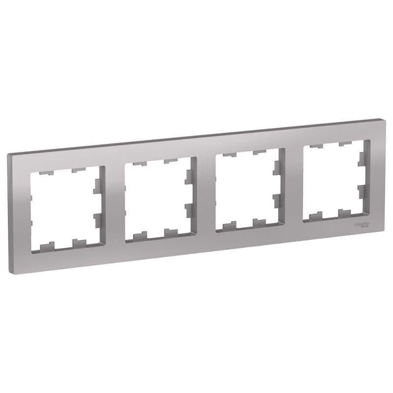Рамка AtlasDesign (цвет алюминий) четырёхместная. - Устанавливается в вертикальном и горизонтальном положениях. - Лицевые детали из качественного ABS-пластика, устойчивого к царапинам и УФ-излучению. - Позволяет гармонично вписать электроустановочное изделие в интерьер помещения.