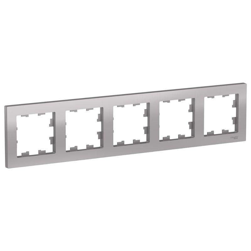 Рамка AtlasDesign (цвет алюминий) пятиместная. - Устанавливается в вертикальном и горизонтальном положениях. - Лицевые детали из качественного ABS-пластика, устойчивого к царапинам и УФ-излучению. - Позволяет гармонично вписать электроустановочное изделие в интерьер помещения.