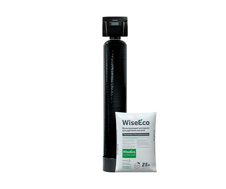 В составе системы идёт WiseEco F – фильтрующий материал для удаления растворённого и нерастворённого в воде железа. Железо, выпавшее в осадок, задерживается слоями фильтрующей загрузки и удаляется при обратной промывке без лишних затрат воды. Загрузка не требует химических реагентов для регенерации. За счёт данной особенности фильтрующий материал WiseEco F не причиняет вреда окружающей среде и гарантирует безопасность очищенной воды.