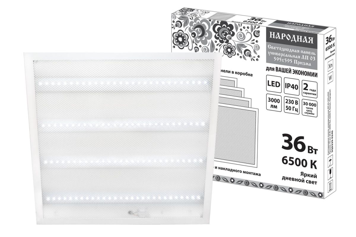 Светодиодная панель универсальная ЛП 03 595х595 Призма 19 мм 36 Вт 3000 Лм, 6500 К, белая, Народная