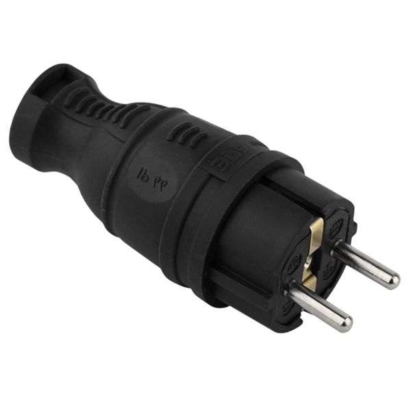 Вилка прямая, каучуковая, с заземлением. Пыле- и влаго-защита IP44. Максимальная мощность - 16 A/3500 Вт